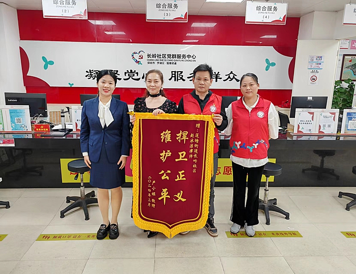2024年3月11日,市民严女士来到罗湖区莲塘街道长岭社区党群服务中心,将一面沉甸甸的锦旗送到了莲塘社区副站长陶三山、广东微众律师事务所管理副主任赵冰洁手上。锦旗上赫然写着“维护公平,捍卫正义”,严女士究竟所为何事?